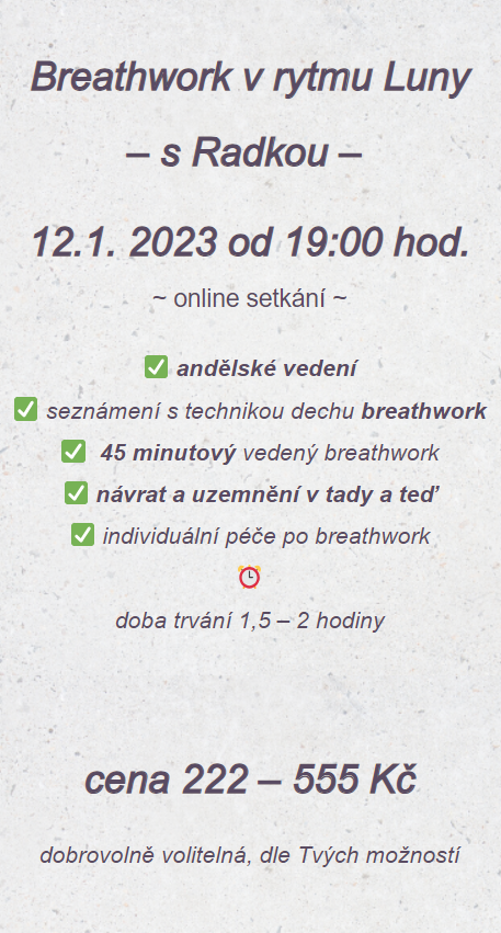 Breathwork v rytmu Luny je určen převážně ženám a probíhá vždy na úplněk a novoluní daného měsíce. Ve vedení dýchání se pravidelně střídáme. Dýchání probíhá online přes platformu ZOOM.